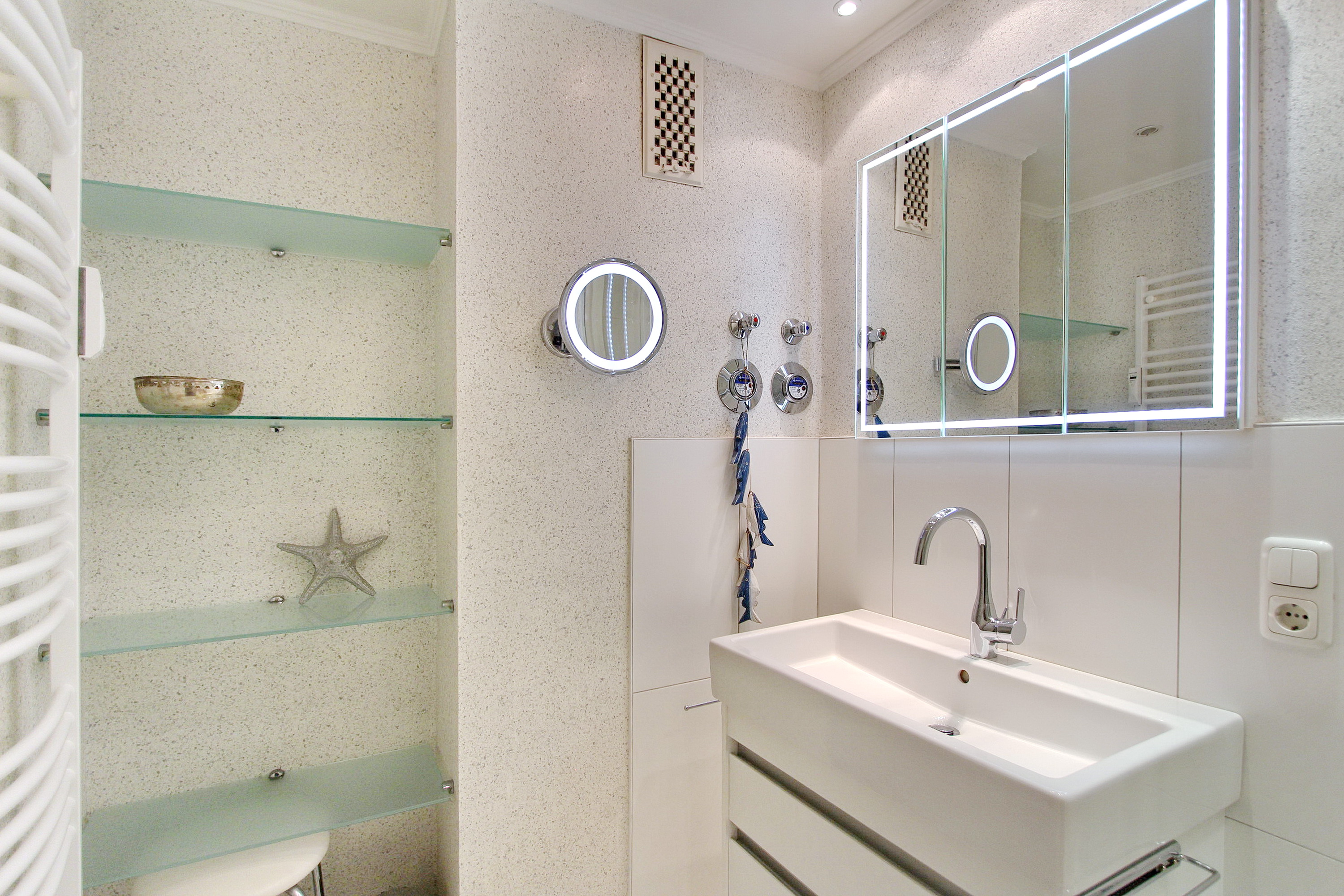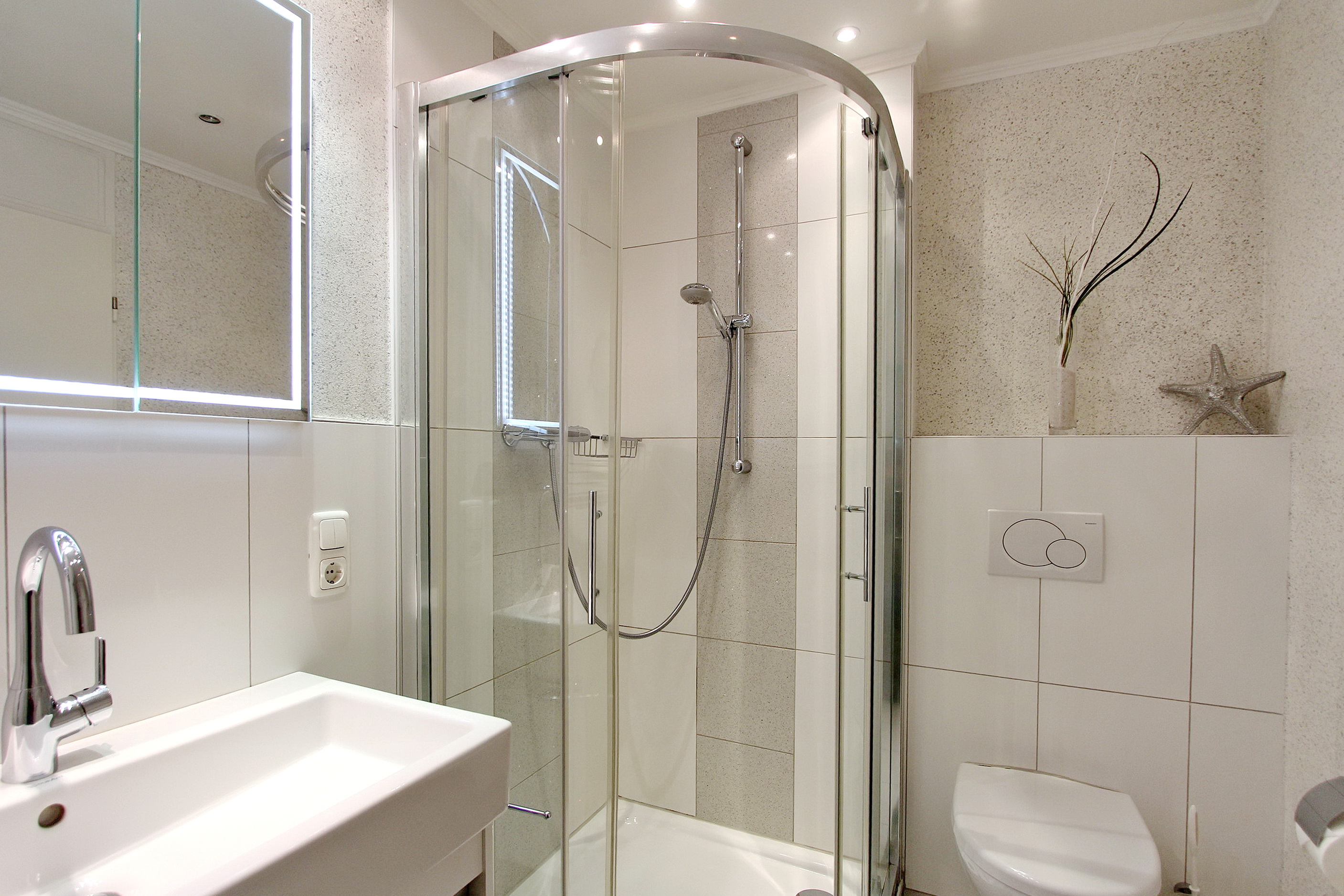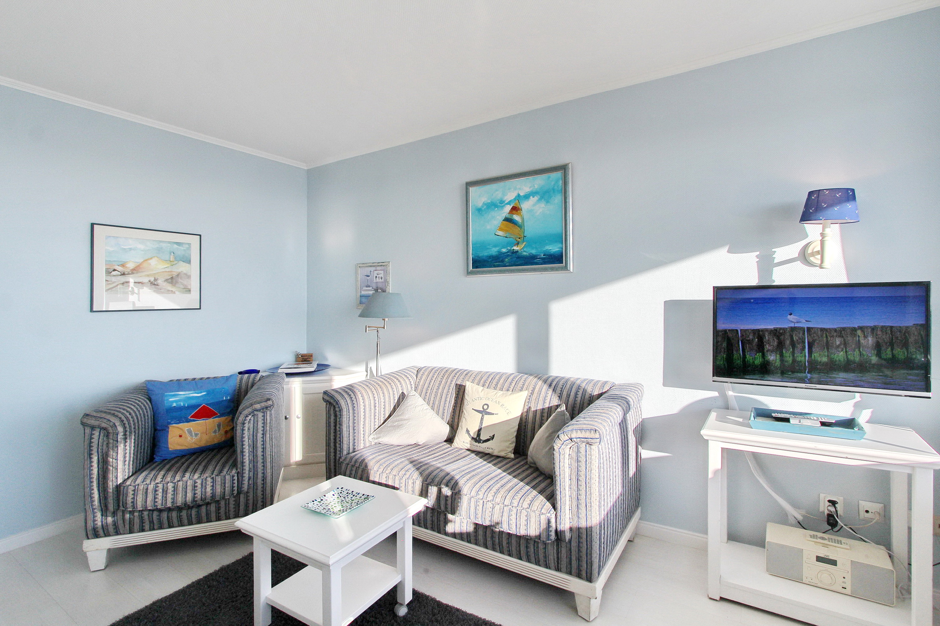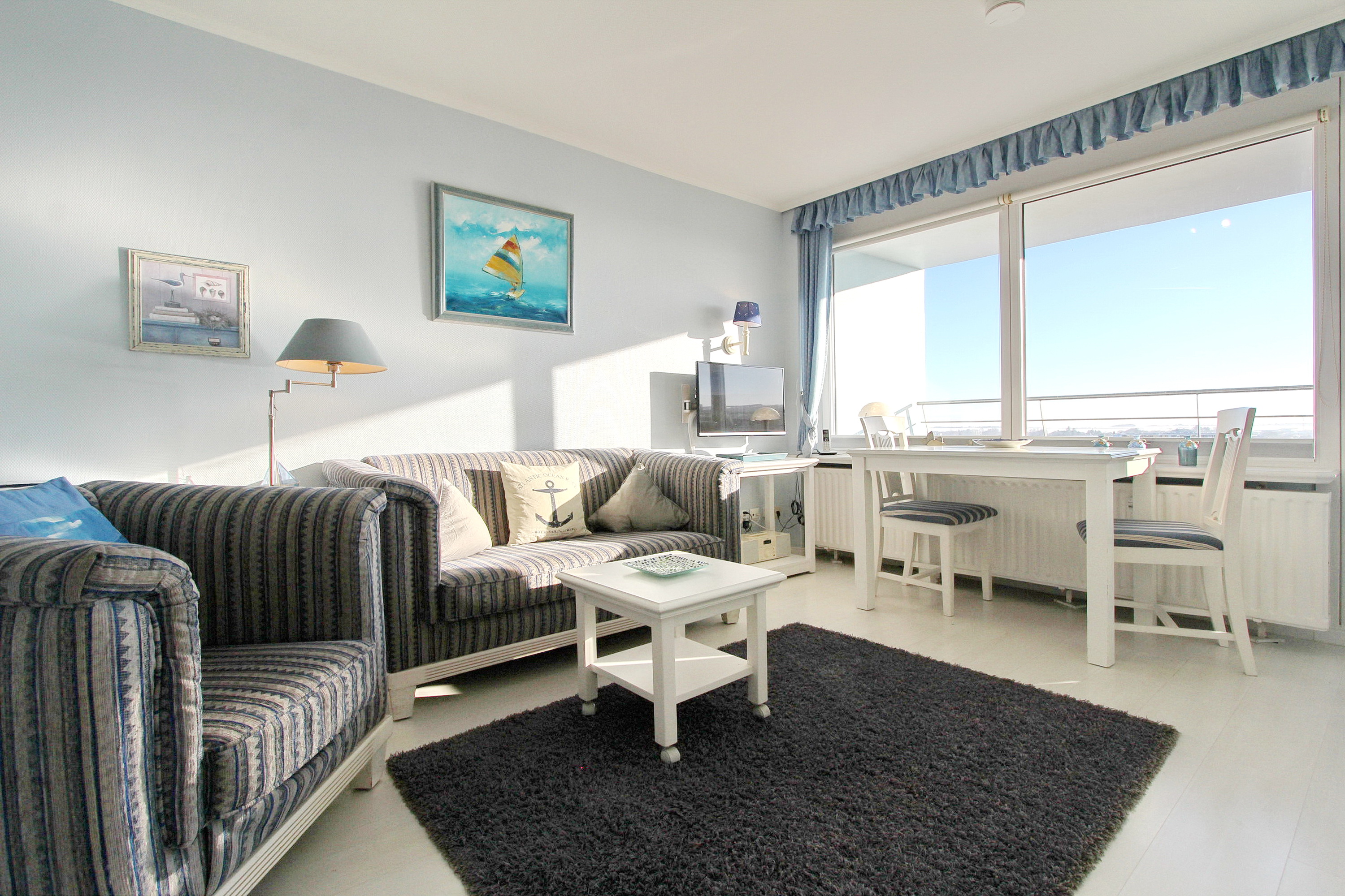 Hübsche Einzimmerwohnung in der 8. Etage im Haus Metropol zur Landseite mit herrlichem Weitblick über die Insel und die Stadt. Bei klarem Wetter auf das nordfriesische Wattenmeer bis zum Festland. Der kombinierte Wohn-/Schlafraum mit vorgelagertem großen Ostbalkon verfügt über Einzelschrankbetten, einen Essplatz mit 2 Stühlen am Fenster sowie eine Sitzgruppe. Holzfußboden verleiht dem Raum Gemütlichkeit. Das moderne Badezimmer hat eine Dusche. Im Flur befindet sich eine Einbauküche mit Backofen in der sich sie sich bequem selbst verpflegen können. Zur technischen Ausstattung gehört: ein schwenkbarer Flachbildfernseher mit integriertem DVD Player, Radio mit IPod Station, Telefon. Ein freies WLAN Netzwerk (WEG Haus Metropol - Passwortfrei - ohne Gewähr) steht ihnen kostenfrei zur Verfügung. Wohnungsgröße 30 m².