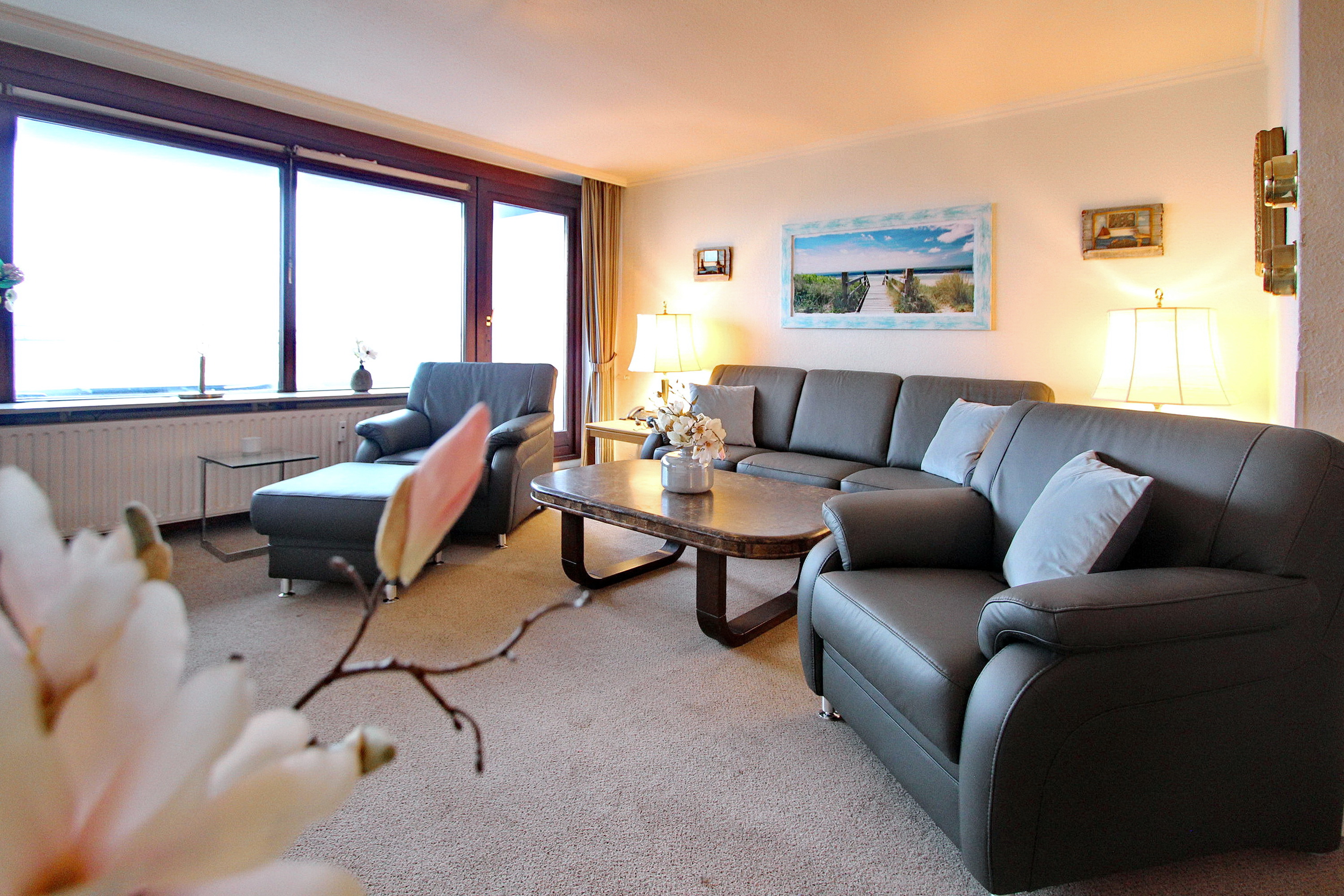 Große Zweizimmerwohnung in der 7. Etage im Haus Sylter Welle mit herrlichem Blick über die Insel. Der Wohnraum mit vorgelagertem Ostbalkon hat Balkonmöbel und Auflagen. Zur Ausstattung gehört ein Doppelschrankbett im Wohnzimmer, eine Eßgruppe mit 4 Stühlen und eine Couch und Fernsehsessel. Das Schlafzimmer hat ein Doppelbett und ebenfalls einen Ostbalkon. Im Badezimmer gibt es eine Halbrunddusche. In der sep. Einbauküche mit Backofen können Sie sich selbst verpflegen. Zur technischen Ausstattung gehört: ein Flachbildfernseher, ein Radio mit CD Player und ein Telefon. Das freie WLAN Netzwerk (WEG Haus Sylter Welle - Passwortfrei - ohne Gewähr) steht ihnen kostenfrei zur Verfügung. Wohnungsgröße: ca. 60 m².